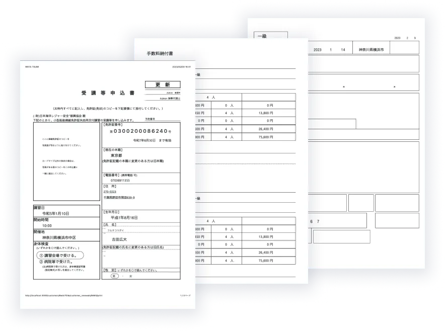 試験申請や免許の更新に際して、必要な各種申請書類を、クリックするだけで簡単に印字することができます。宛名ラベルの印刷も可能です。